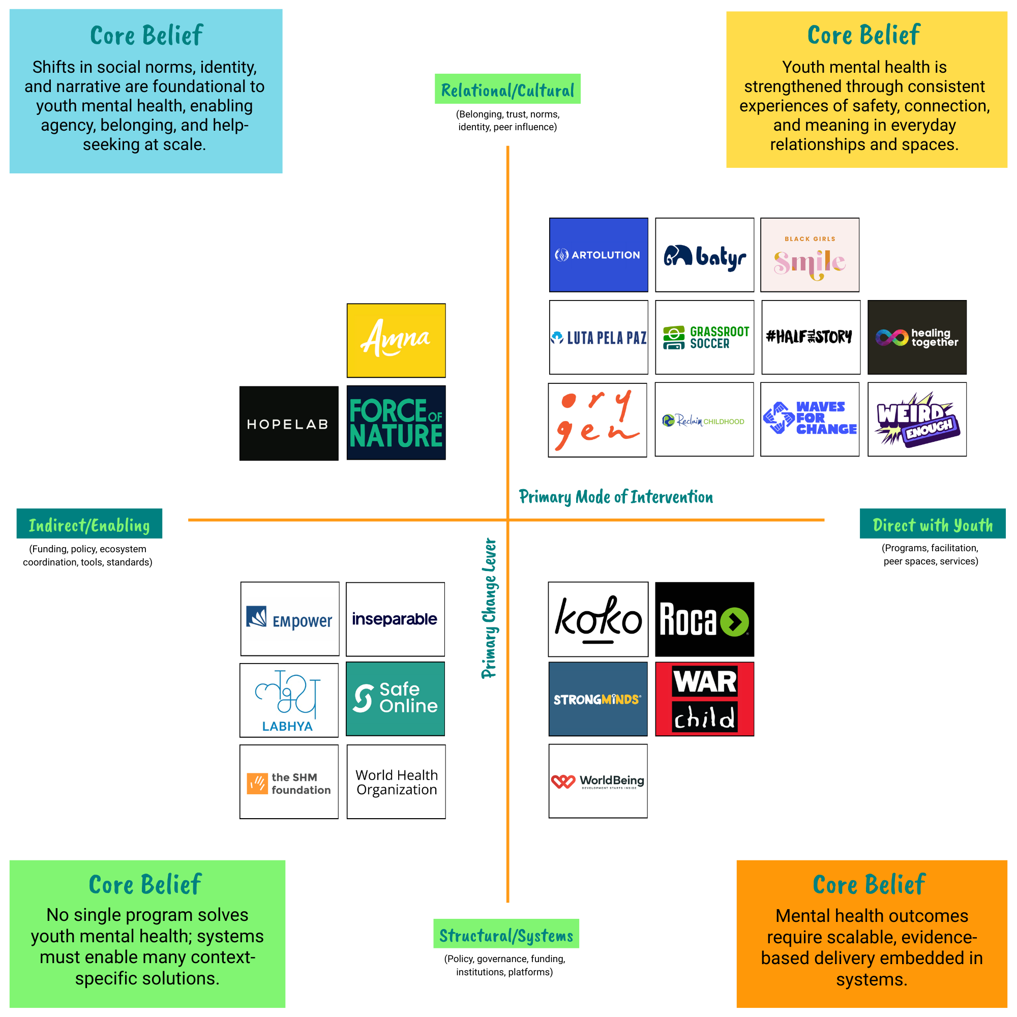 There is no single path to improving youth mental health. This map reflects what we’ve heard across dozens of conversations with practitioners, researchers, funders, and youth leaders: change happens through relationships, culture, services, and systems—and none of these alone is sufficient.